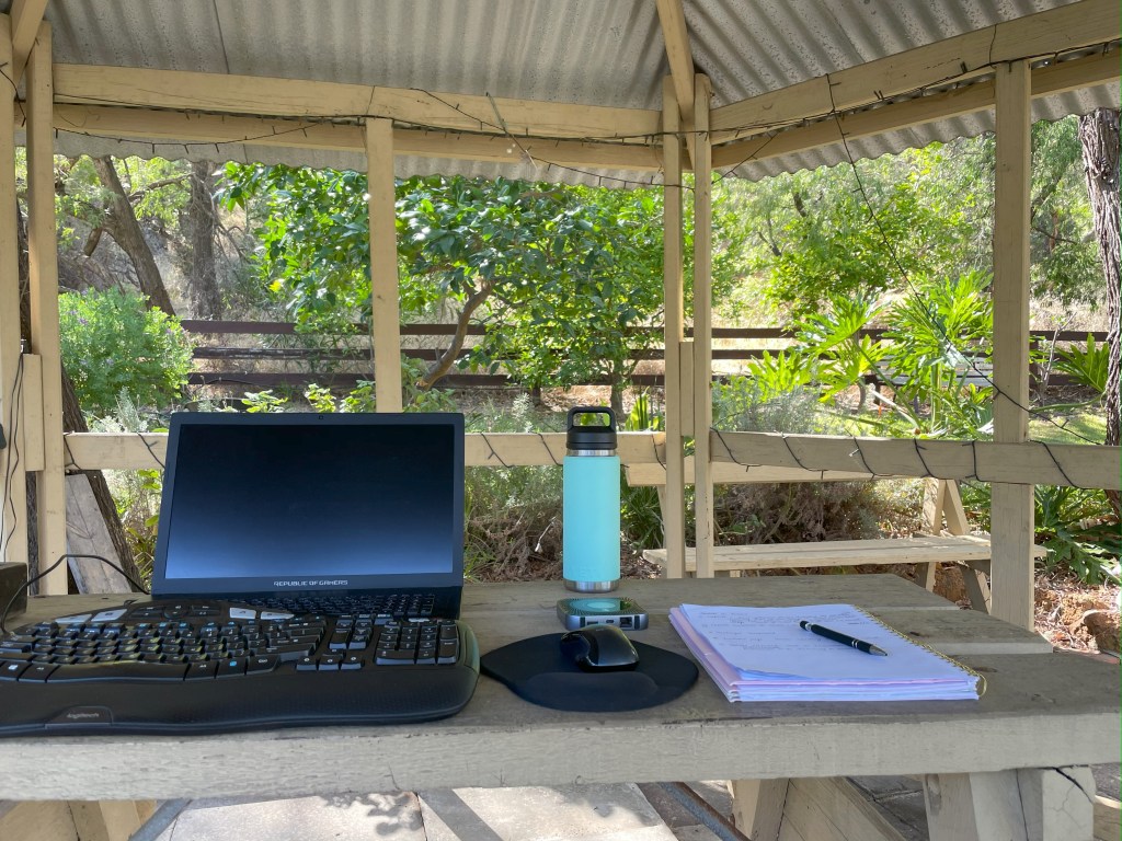 I’ve worked in a small caravan, where my locations were the kitchen bench (stanbing), fold out dining table, outside in the annex or for one awesome location I had the use of a gazebo located next to our site. Obviously, I had to pack my things away each day, but it was a lovely environment to work in. These days we have a customised caravan with an office area where I can place my laptop and still use the table for meals and other activities.