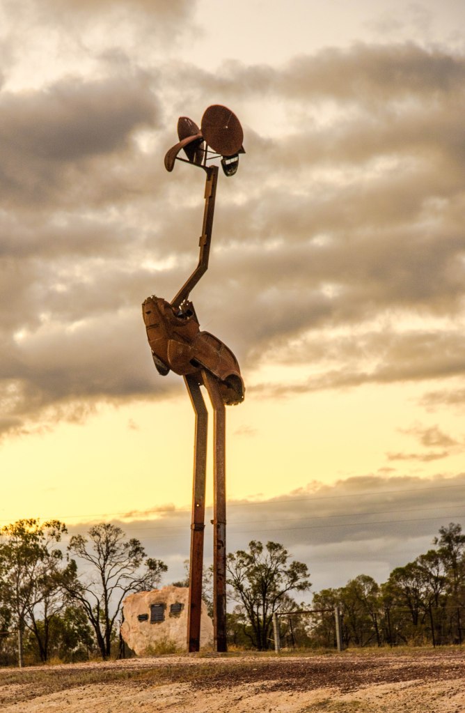 We were hoping to be able to camp at Lightning Ridge, but their caravan parks were also closed with COVID19 messages. Our last option was another road-side camp identified by Stanley the Emu near the entrance to Lightning Ridge!! Stanley the Emu is an 18m tall sculpture created by John Murray the talented artist from Lightning Ridge built out of scrap metal, three Volkswagen bodies and a pair of rusting satellite dishes. Brilliant!