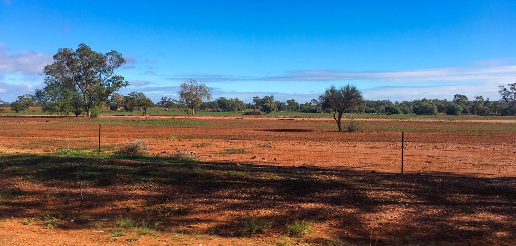 Our overnight rest stop on the Hay Flats of western NSW, was not a quiet one, to be fair it is a major truck route, and we did get some peace between midnight and 4am!! Being woken so early enabled us to witness a beautiful sunrise and a visit from sheep grazing on the saltbush in the paddock next to us, whilst it was freezing, we managed to enjoy these wonders from outside the van.